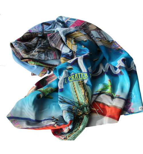 Das SEIDENTUCH, kräftig in den Farben und glänzend in sehr hohen Qualität. Der PRATERSACK, eine feste farbenprächtiger Tasche, bzw. Shopper mit viel Platz darin. Eine Innentasche trägt zur Ordnung bei.